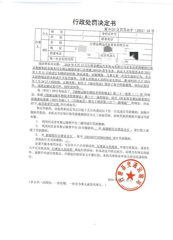 行唐县鹏远汽车贸易有限公司未按照规定的周期和频次对冀AKW429进行车辆检验检测案