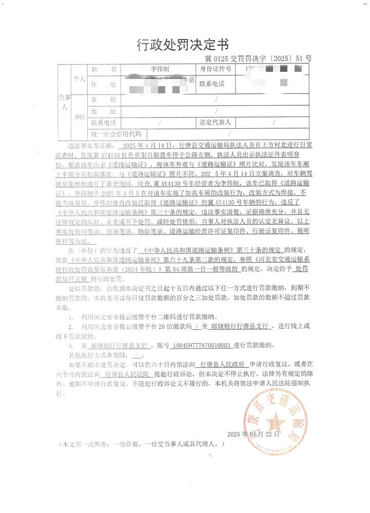 李伟制擅自改装已取得车辆营运证的冀A.Y4130号车辆行为案