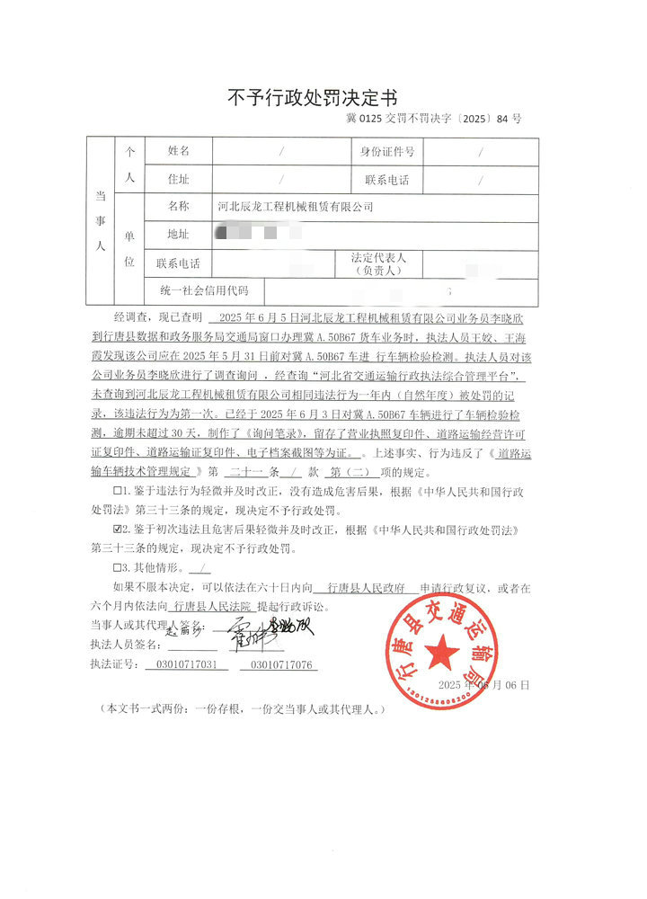 河北辰龙工程机械租赁有限公司未按照规定的周期和频次对冀A.50B67进行车辆检验检测案