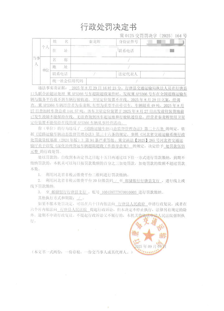 秦龙辉使用卫星定位装置出现故障不能保持在线的冀AP3366号车从事经营活动案