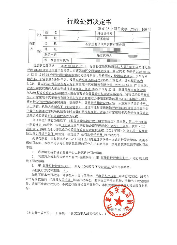 石家庄旺卡汽车销售有限公司车货总质量超过公路限定标准的冀AGF250车辆在公路上擅自行驶行为案