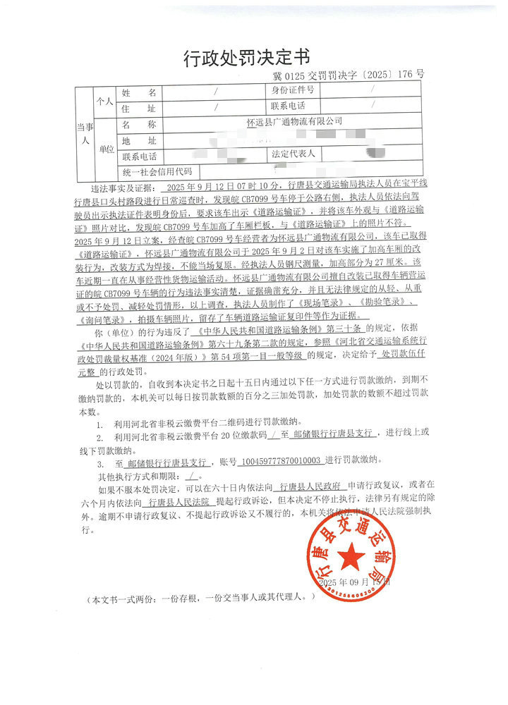 怀远县广通物流有限公司擅自改装已取得车辆营运证的皖CB7099号车辆案