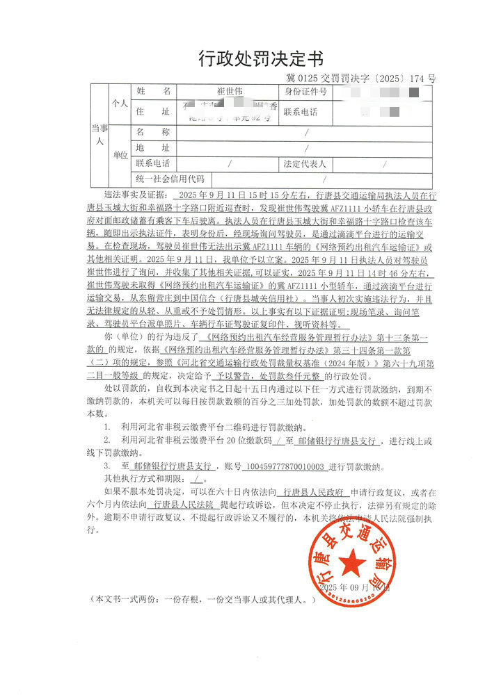 崔世伟驾驶冀AFZ1111车辆未取得《网络预约出租汽车运输证》,擅自从事网约车经营活动案。