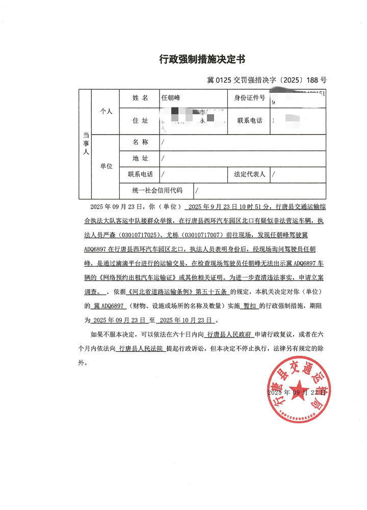 任朝峰驾驶冀ADQ6897车辆未取得《网络预约出租汽车运输证》擅自从事网约车经营活动案