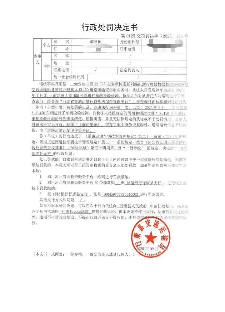 郭秋栋未按照规定的周期和频次对冀A.KL450进行车辆检验检测案