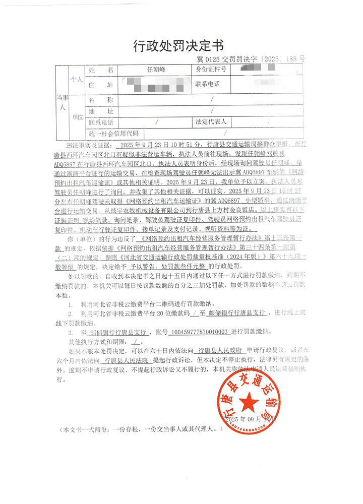 任朝峰驾驶冀ADQ6897车辆未取得《网络预约出租汽车运输证》擅自从事网约车经营活动案