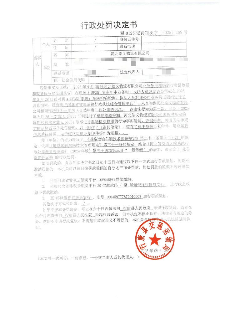河北皓义物流有限公司未按照规定的周期和频次对冀A.5F351进行车辆检验检测案