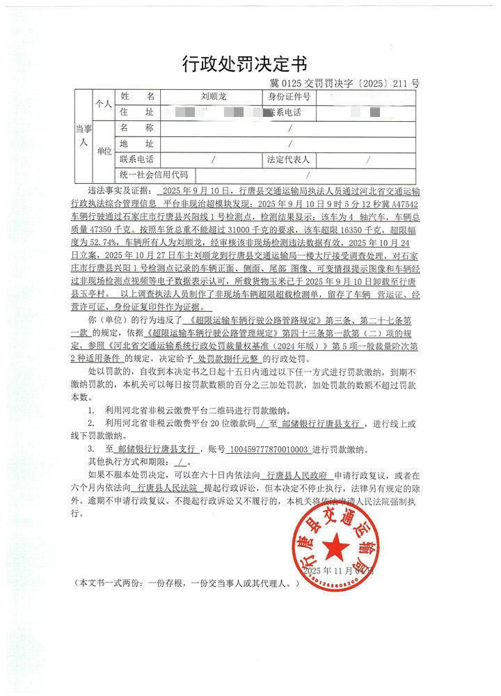 刘顺龙车货总质量超过公路限定标准的冀A47542车辆在公路上擅自行驶行为案