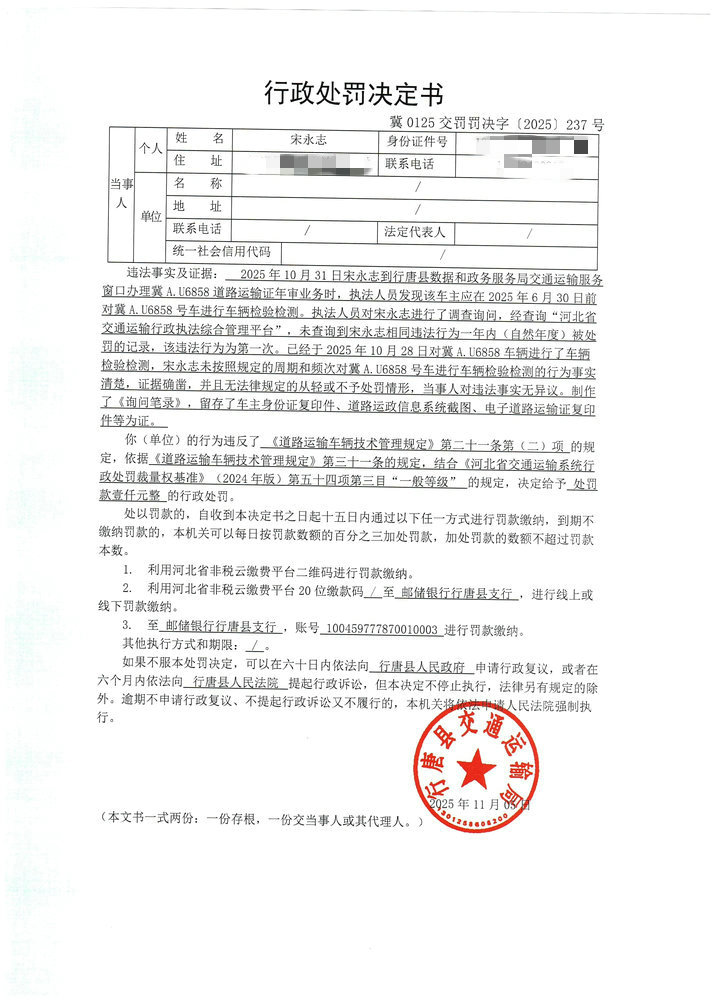 宋永志未按照规定的周期和频次对冀A.U6858进行车辆检验检测案