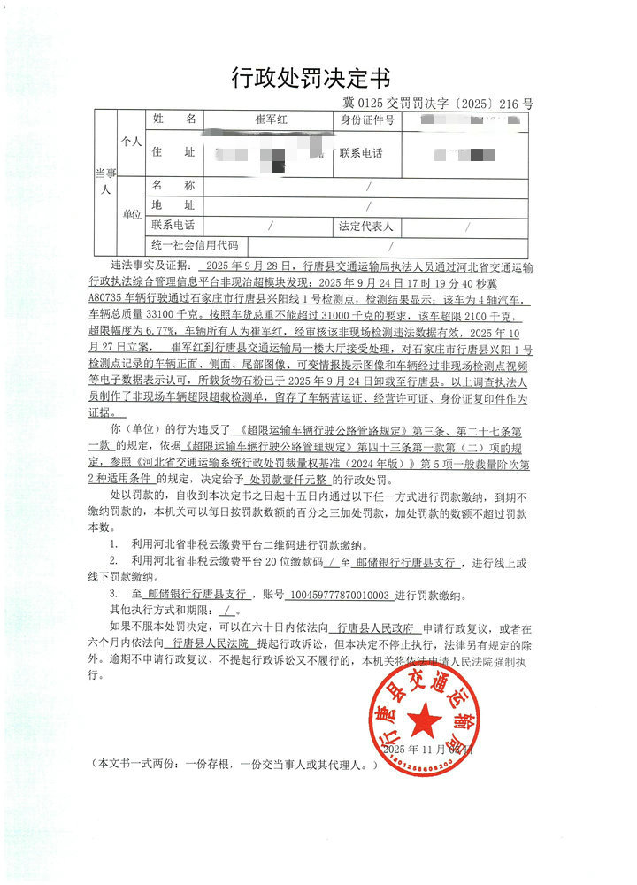 崔军红车货总质量超过公路限定标准的冀A80735车辆在公路上擅自行驶行为案