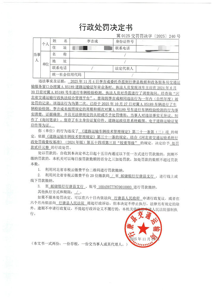 李吉成未按照规定的周期和频次对冀A.R5189进行车辆检验检测案