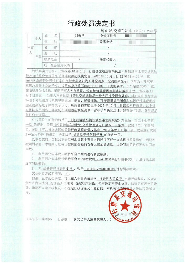 刘勇昆车货总质量超过公路限定标准的冀A967N6车辆在公路上擅自行驶行为案