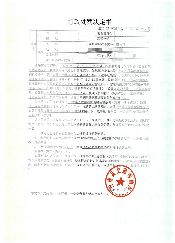 石家庄晨骁汽车贸易有限公司擅自改装已取得车辆营运证的冀A1B02挂号车辆案