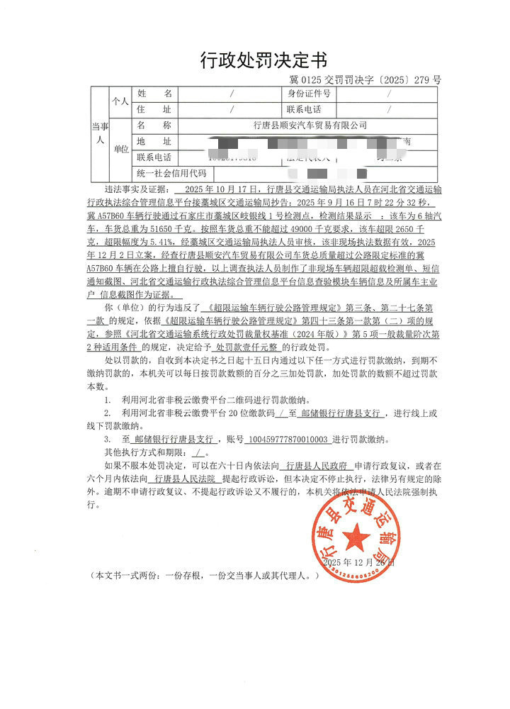 行唐县顺安汽车贸易有限公司涉嫌车货总质量超过公路限定标准的冀A57B60车辆在公路上擅自行驶行为案