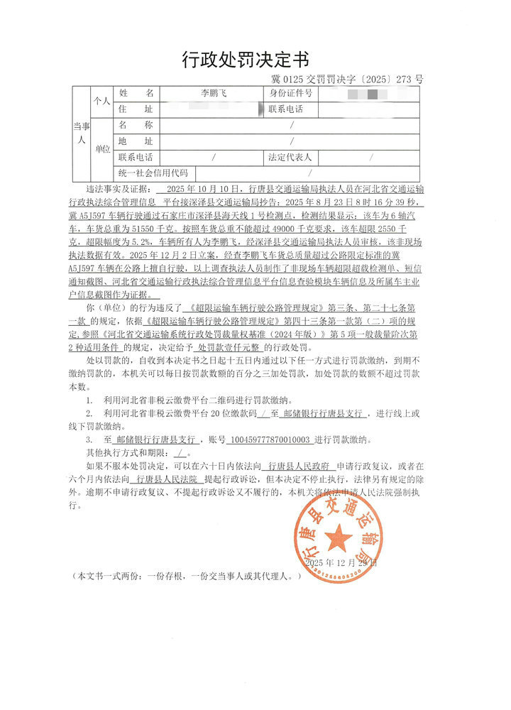 李鹏飞车货总质量超过公路限定标准的冀A5J597车辆在公路上擅自行驶行为案