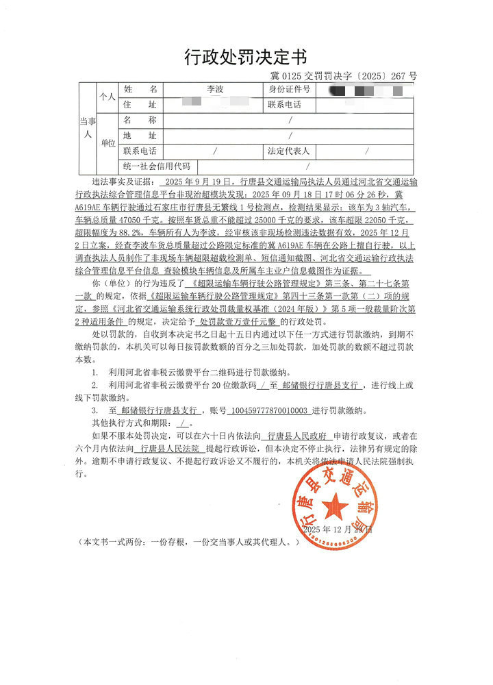 李波车货总质量超过公路限定标准的冀A619AE车辆在公路上擅自行驶行为案