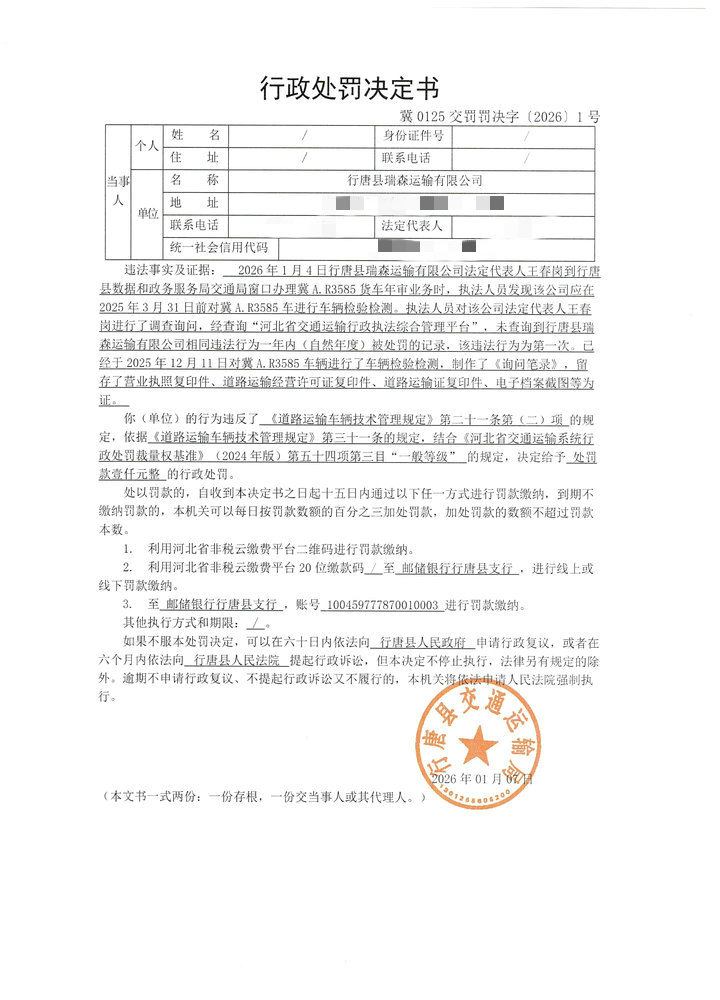 行唐县瑞森运输有限公司未按照规定的周期和频次对冀A.R3585进行车辆检验检测案