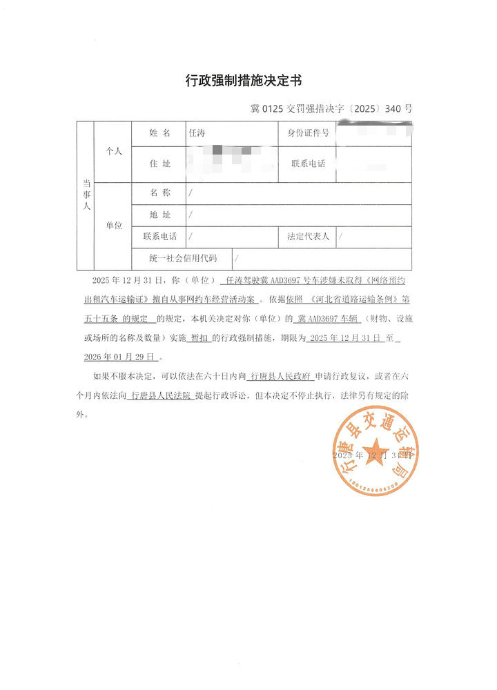 任涛驾驶冀AAD3697车辆未取得《网络预约出租汽车运输证》擅自从事网约车经营活动案