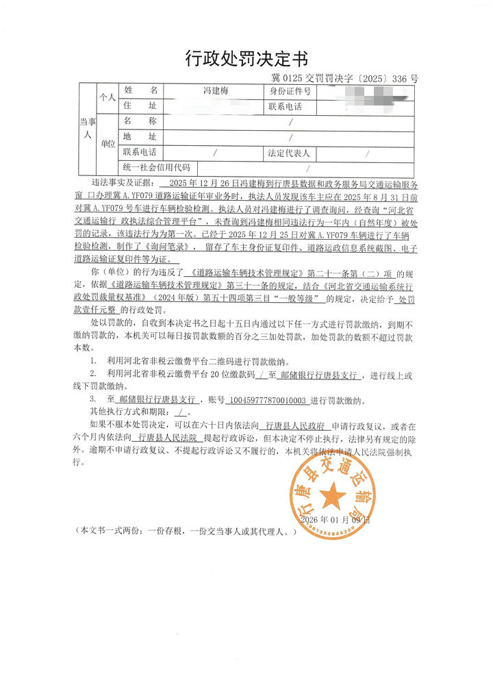 冯建梅未按照规定的周期和频次对冀A.YF079进行车辆检验检测案