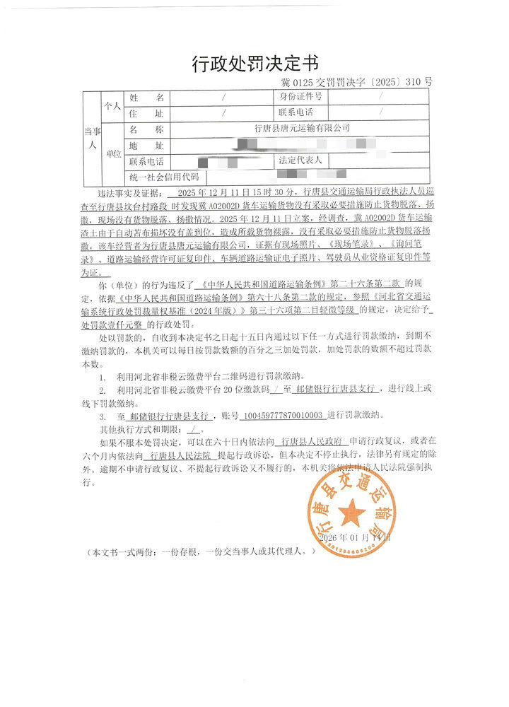 行唐县唐元运输有限公司使用冀A02002D货车运输货物没有采取必要措施防止货物脱落、扬撒案