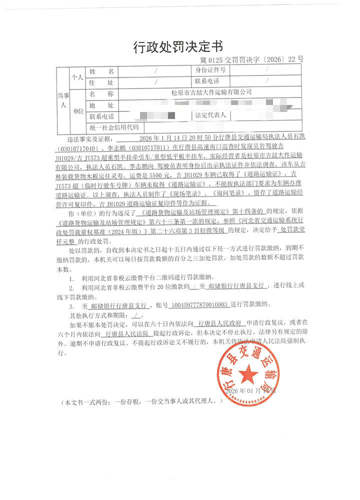 松原市吉喆大件运输有限公司取得道路运输经营许可使用无道路运输证的吉JY573超号车参加普通货物运输案