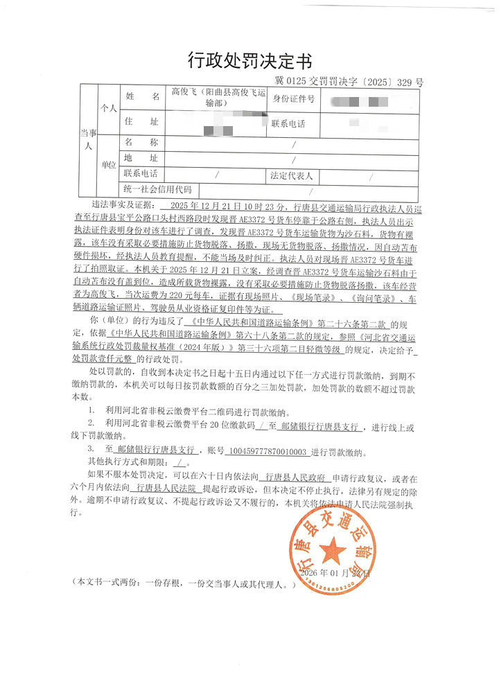 高俊飞(阳曲县高俊飞运输部)使用晋AE3372号货车运输货物没有采取必要措施防止货物脱落、扬撒案