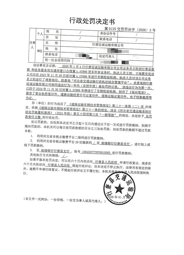 行唐迈诚运输有限公司未按照规定的周期和频次对冀A.AY886进行车辆检验检测案