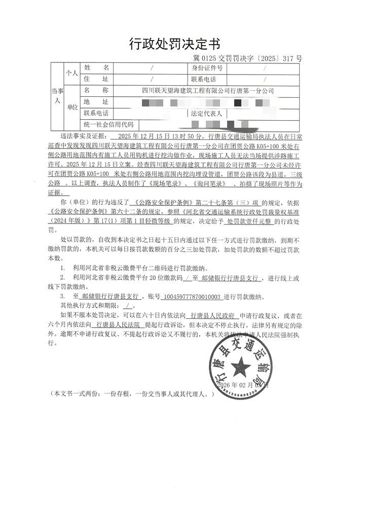 四川联天望海建筑工程有限公司行唐第一分公司未经许可在公路用地范围内埋设管道案