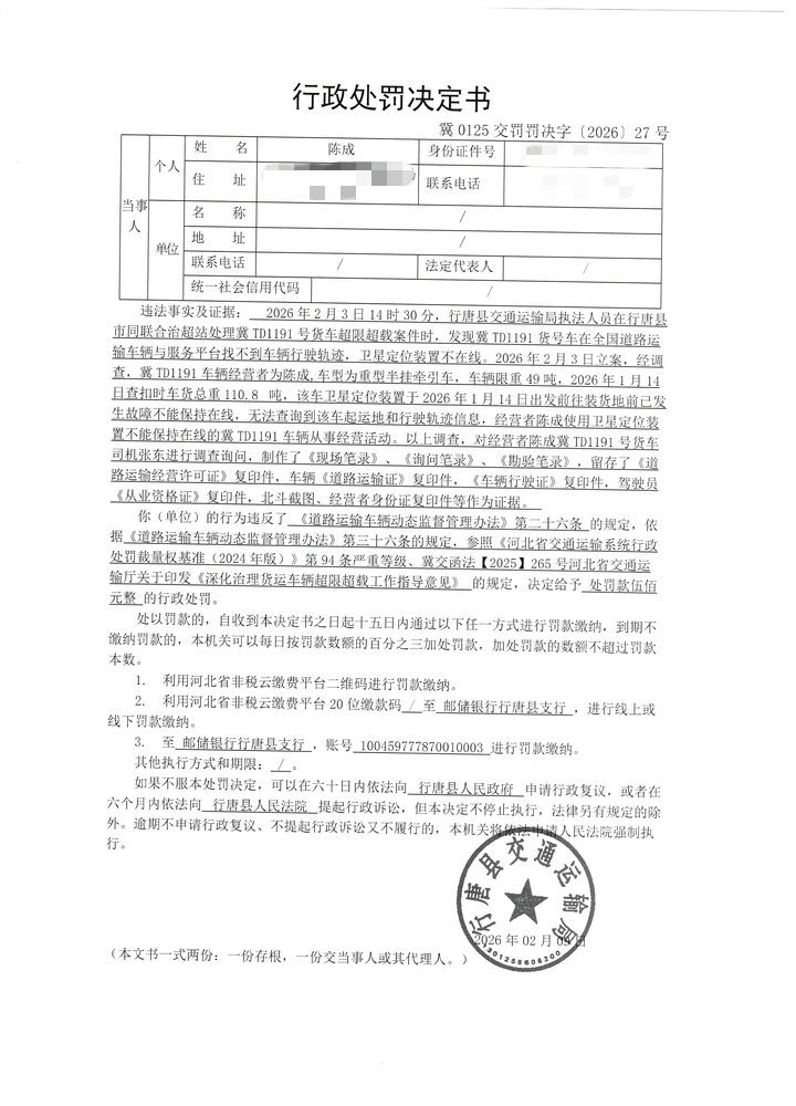 陈成使用卫星定位装置出现故障不能保持在线的冀TD1191号运输车辆从事经营活动案