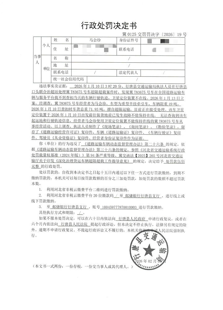 马会珍使用卫星定位装置出现故障不能保持在线的冀T83675号运输车辆从事经营活动案