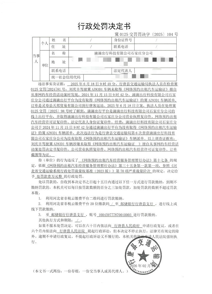 滴滴出行科技有限公司石家庄分公司提供服务的冀AZ83D1车辆未取得《网络预约出租汽车运输证》案