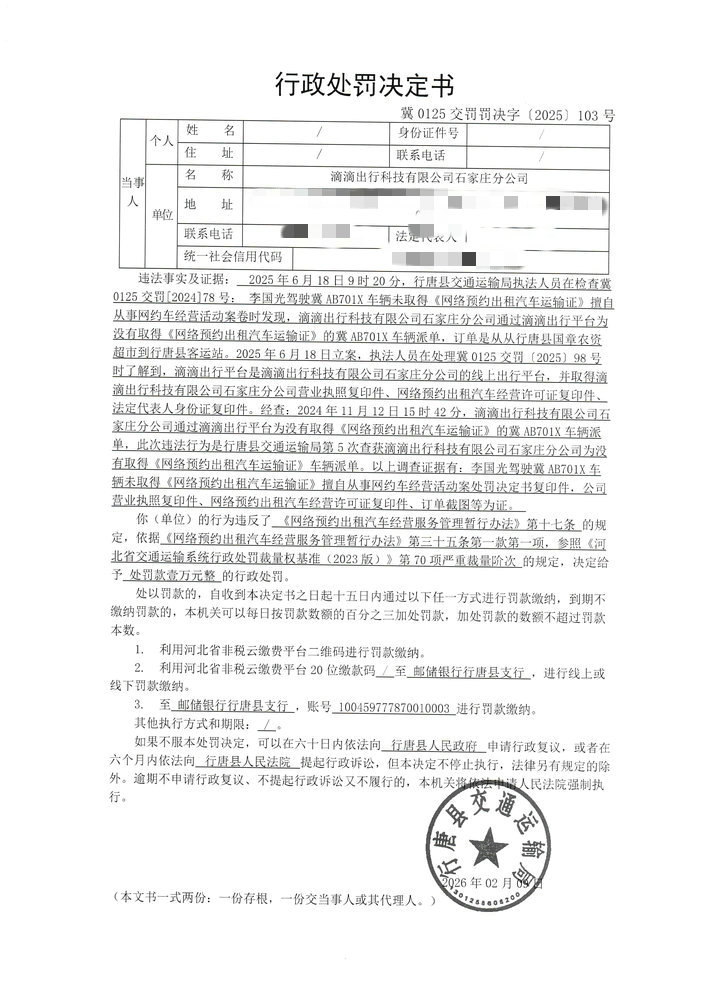 滴滴出行科技有限公司石家庄分公司提供服务的冀AB701X车辆未取得《网络预约出租汽车运输证》案