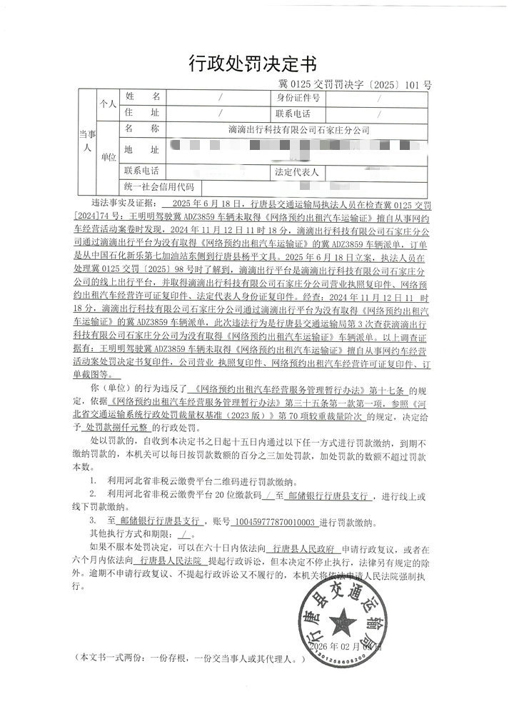 滴滴出行科技有限公司石家庄分公司提供服务的冀ADZ3859车辆未取得《网络预约出租汽车运输证》案