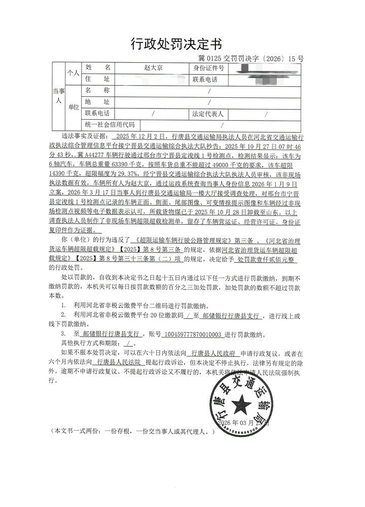 赵大京车货总质量超过公路限定标准的冀A44277车辆在公路上擅自行驶行为案