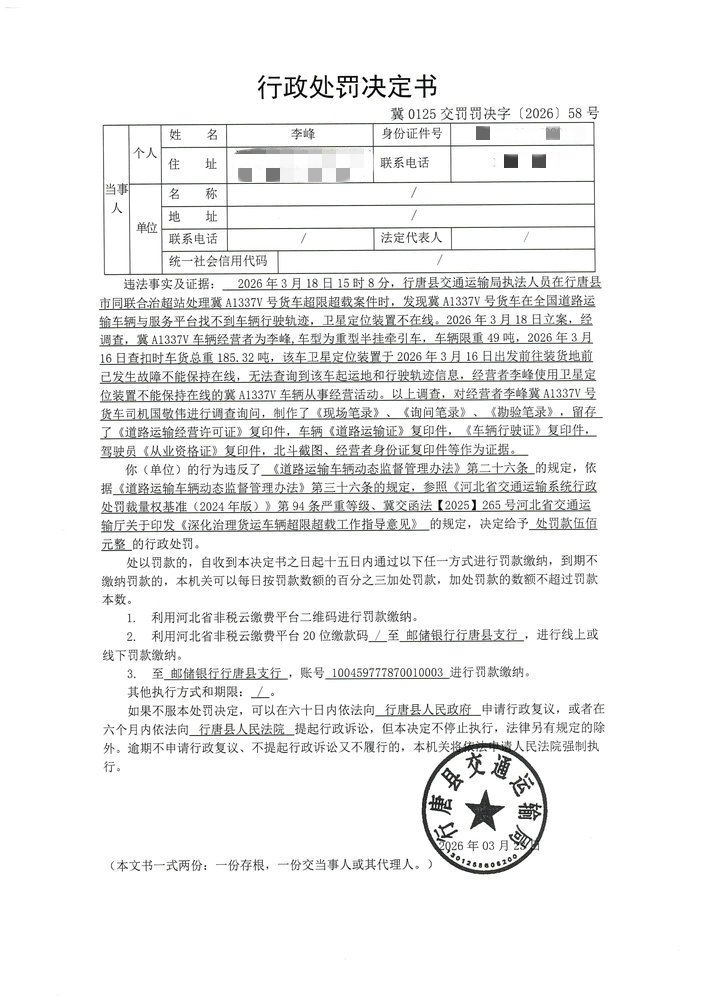 李峰使用卫星定位装置出现故障不能保持在线的冀A1337V号运输车辆从事经营活动案