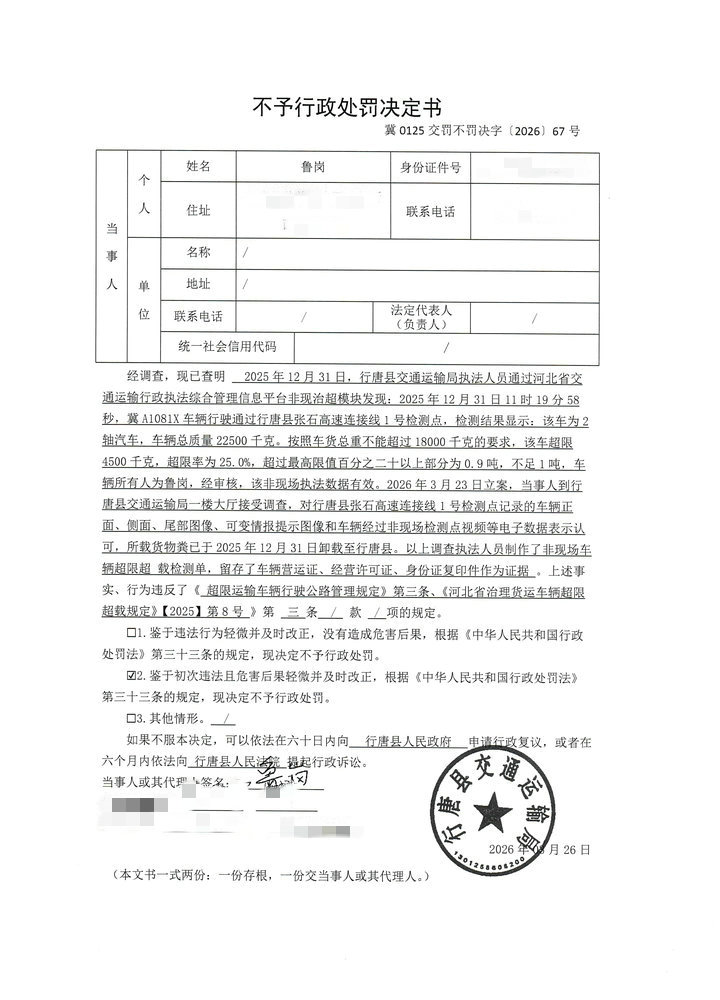鲁岗车货总质量超过公路限定标准的冀A1081X车辆在公路上擅自行驶行为案