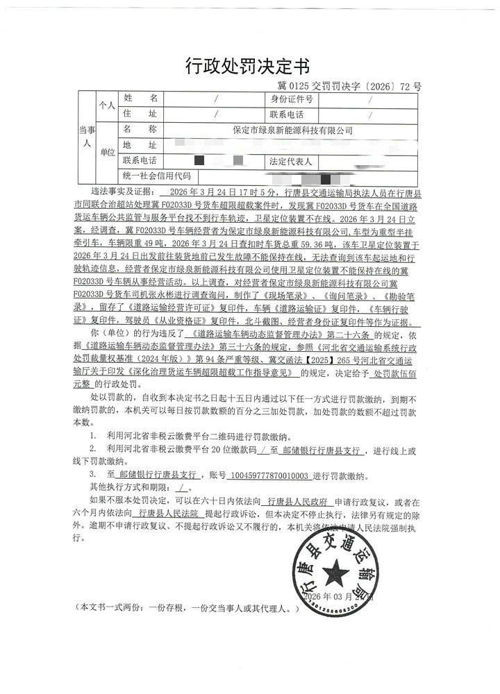 保定市绿泉新能源科技有限公司使用卫星定位装置出现故障不能保持在线的冀F02033D号车从事经营活动案