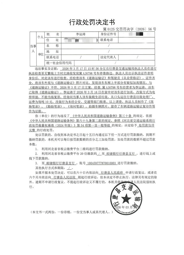 李运涛擅自改装已取得车辆营运证的冀AJ6798号车辆案