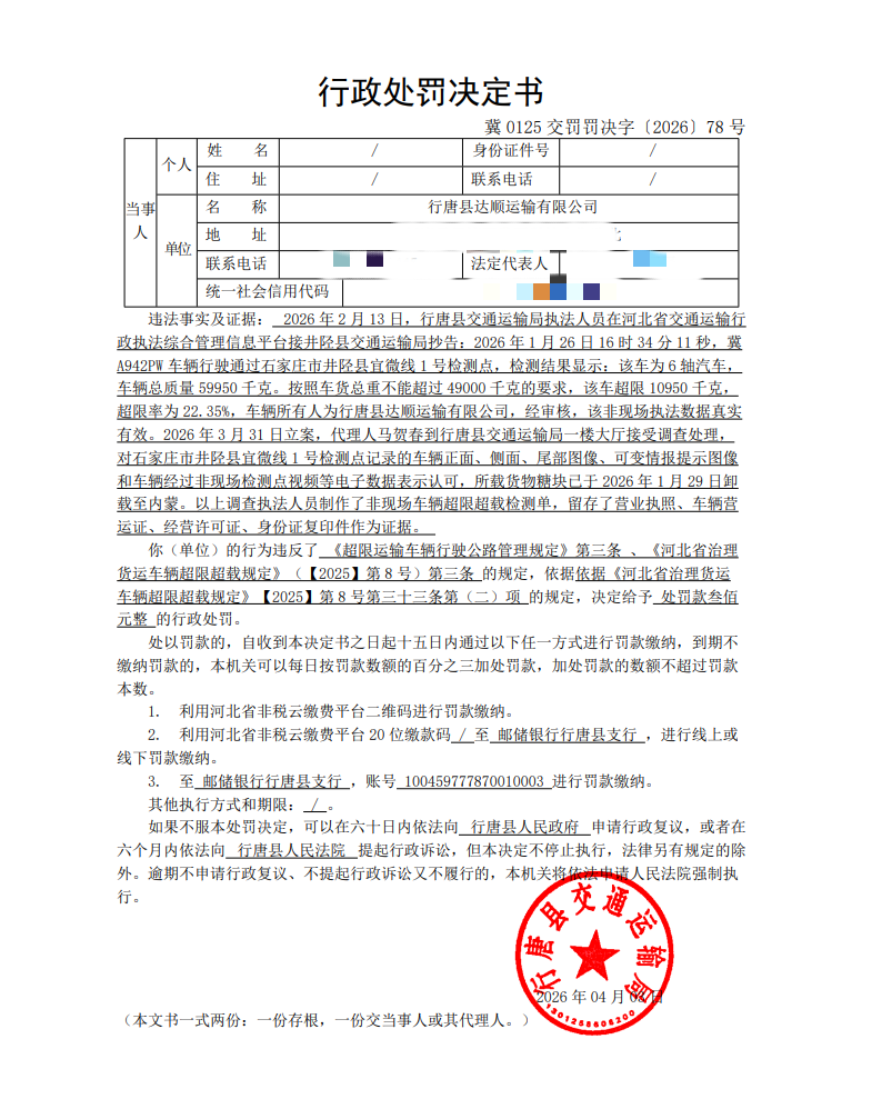 行唐县达顺运输有限公司所属冀A942PW车辆经非现场检测设备检测认定的违法超限运输行为案