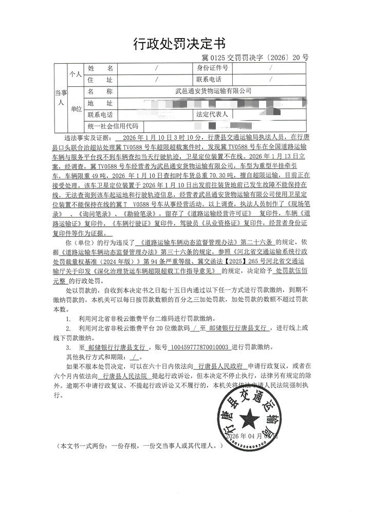 武邑通安货物运输有限公司使用卫星定位装置出现故障不能保持在线的冀TV0588号运输车辆从事经营活动案