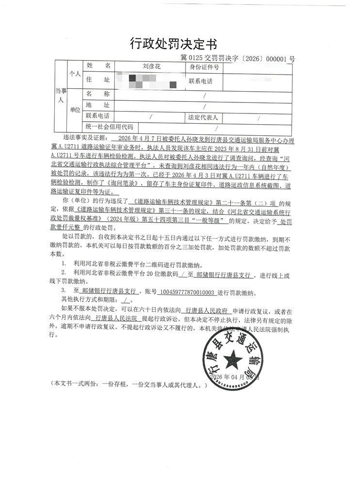 刘彦花未按照规定的周期和频次对冀A.U2711货车进行车辆检验检测案