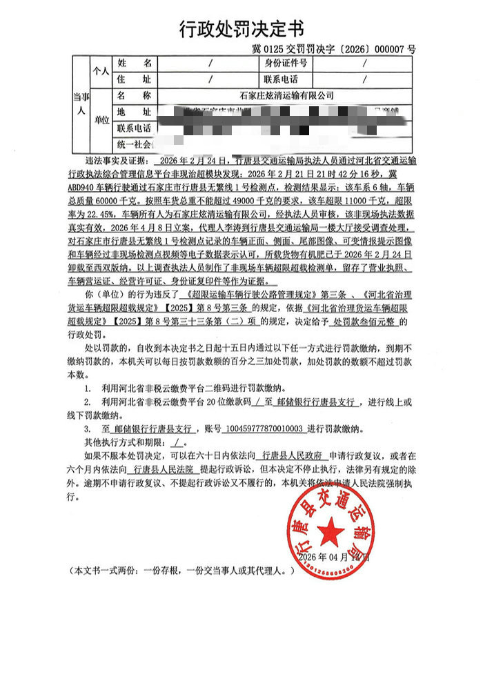 石家庄炫清运输有限公司所属冀ABD940车辆经非现场检测设备检测认定的违法超限运输行为案