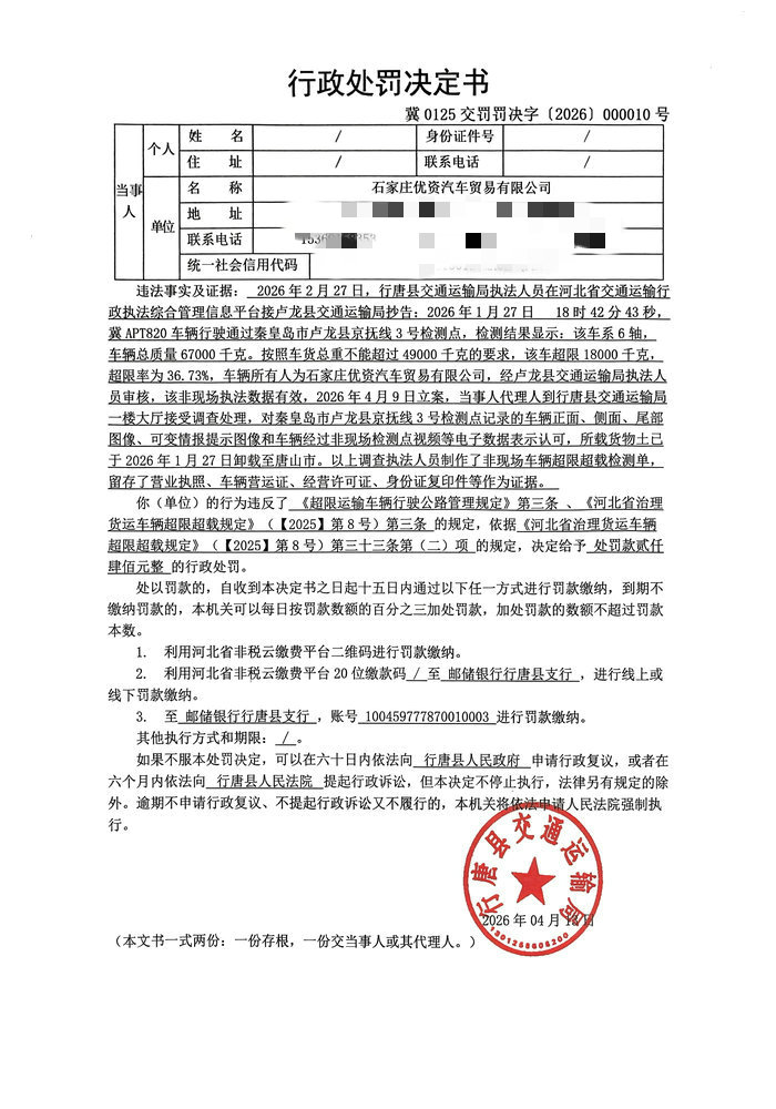 石家庄优资汽车贸易有限公司所属冀APT820车辆经非现场检测设备检测认定的违法超限运输行为案