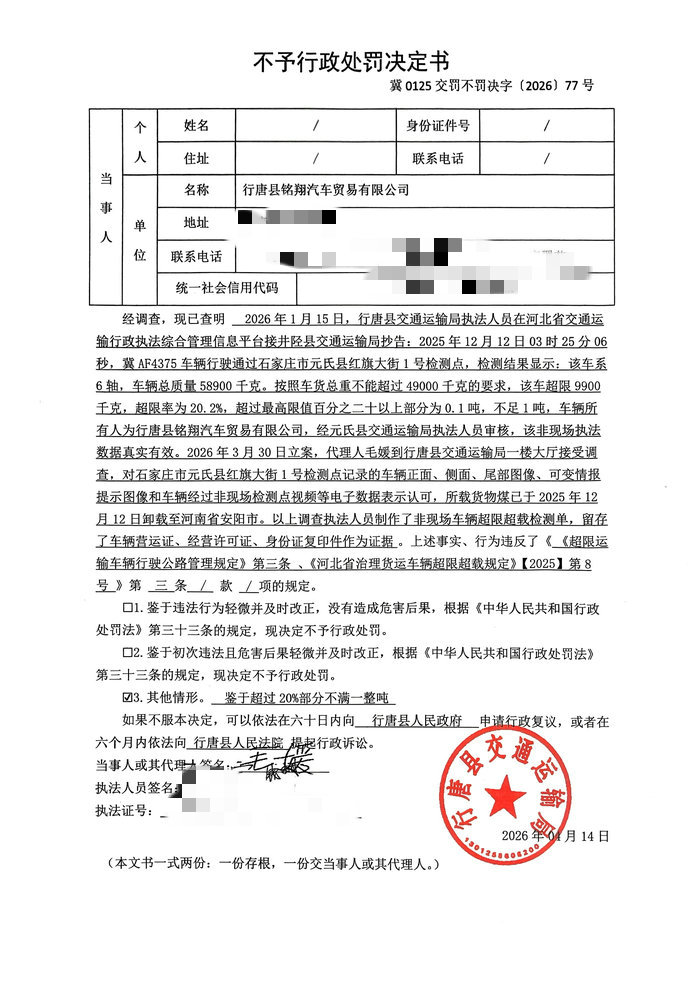行唐县铭翔汽车贸易有限公司所属冀AF4375车辆经非现场检测设备检测认定的违法超限运输行为案