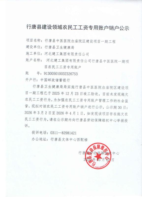 行唐县建设领域农民工工资专用账户销户公示