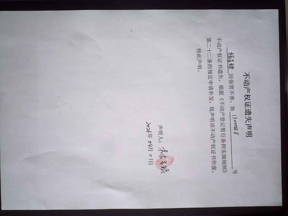 杨吉锁因保管不善,将坐落于行唐县章武路生产公司家属楼北楼西单元2楼西门,面积66.60平方米,房屋所有权证证号:13000228号丢失,根据《不动产登记暂行条例实施细则》有关规定申请补发。