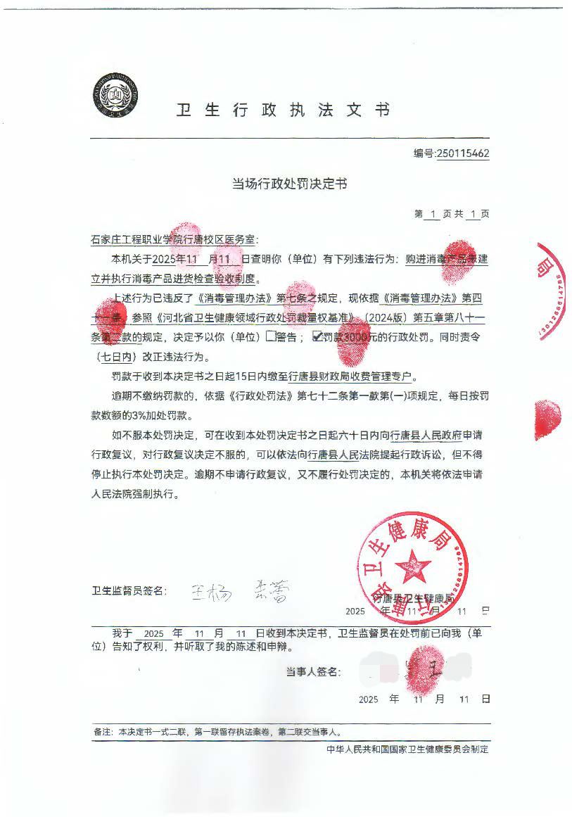 石家庄工程职业学院行唐校区医务室购进消毒产品未建立并执行消毒产品进货检查验收制度案